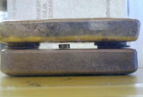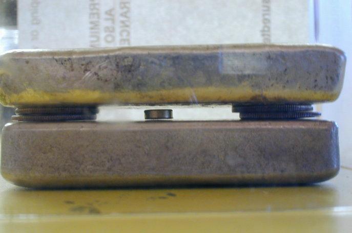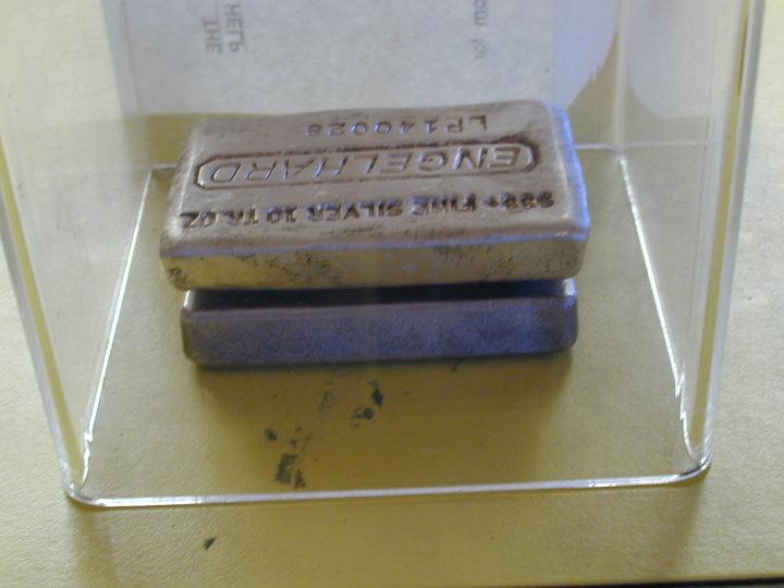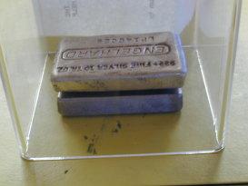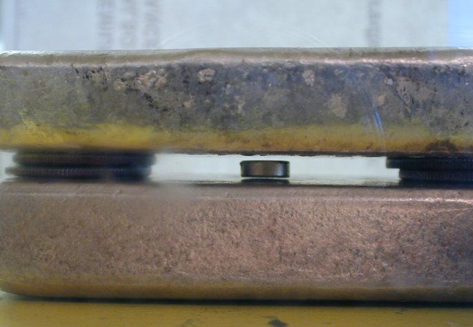 All the hoi-polloi use carbon graphite or bismuth for diamagnetic plates, so I decided to use slabs of pure silver instead :-). Seriously, I did get a couple of pounds of bismuth (cheapest source: United Nuclear), but I followed the usual instructions on the Web about using the bottoms of soda cans as molds and they ended up too rounded. I found that it's important to have the diamagnetic slabs as smooth and flat as possible, otherwise the "floating" magnet is not stable. So I will be remelting the bismuth into flat-bottomed muffin tins, but for now remembered that I had some 10 ounce ingots of silver laying around and used those after reading that silver was diamagnetic too. And it worked! |