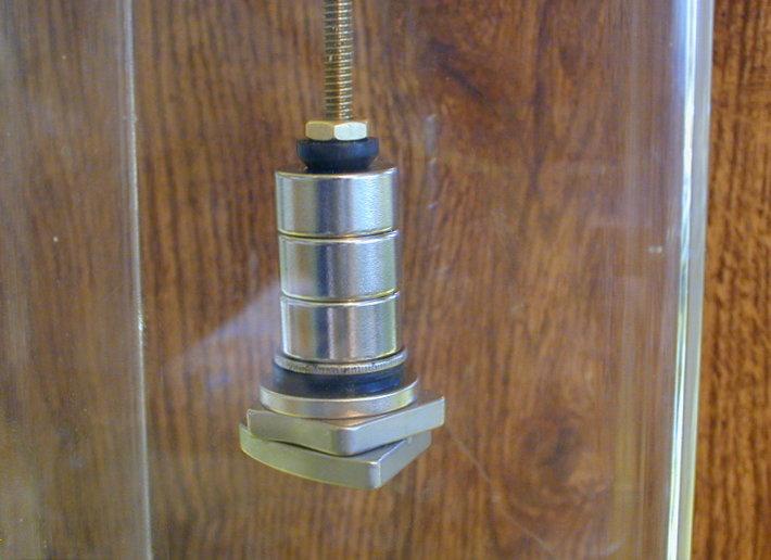 Here's a closeup of the gravity compensating magnets. All of them are NIB type (neodymium-iron-boron) and include ring magnets, a disc magnet, and a reclaimed magnet from a hard disk drive. I recommend the wonderful folks at Wondermagnet if you want to buy some of your own. |